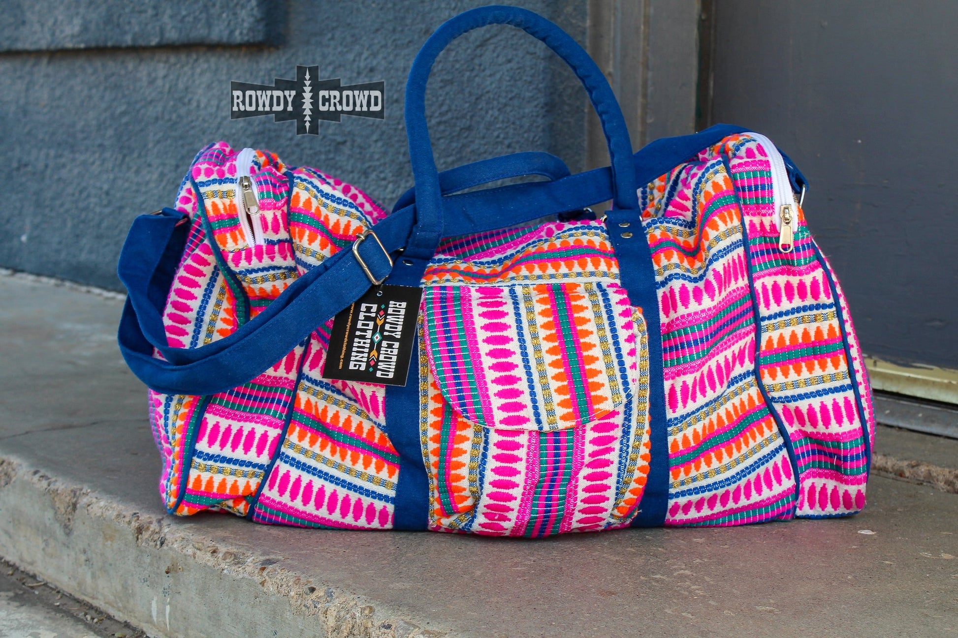 The Winnsboro Weekender Bag is an ideal companion for weekend getaways. The spacious bag measures 22"H x 10"W x 12"D, is constructed from a durable blend of 30% Polyester and 40% Acrylic, and features bright southwest patterning. Side and front pockets offer extra storage for small items. Perfect for your next trip!